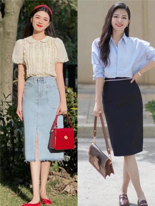 如果是穿半身裙,那么可以选择直筒的版型,直筒裙可以更好的强化下半身的纵向线条感,让腿部看起来非常笔直修长,整体便能营造出轻盈感,更显苗条。