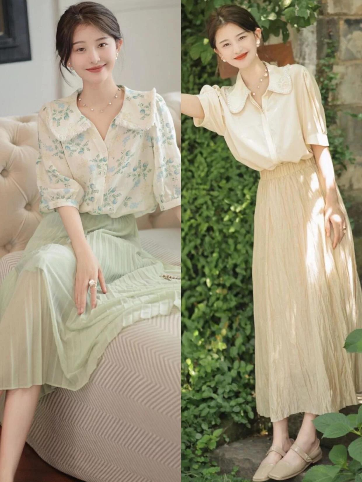 选择相同/相似颜色的上衣和下装进行搭配,比如绿色碎花衬衫+浅绿色半身裙,淡黄色衬衫+淡黄色半身裙,这样可以打造一身非常干净利落的造型,简约又高级。