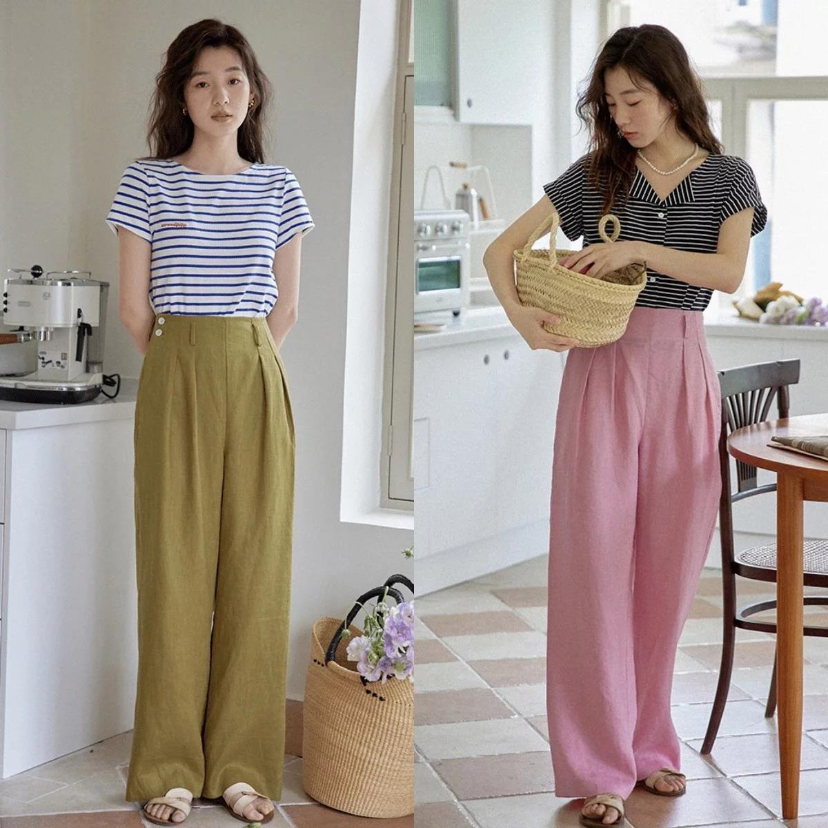 条纹的上衣搭配纯色系的阔腿裤,也是遵循了“上繁下简”的原则,休闲的T恤加上条纹元素,更显时尚有活力,搭配一条纯色的高腰阔腿裤,同时利用“上短下长”的方式来优化身材比例,足以体现穿着者的穿搭能力。