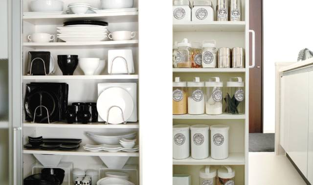 餐具、调味料瓶子如果大小不一、色彩过多,看上去就会杂乱无章。如果换成同一系列的餐具,将调味料也装入贴好标签的统一透明容器中,厨房也可以变得很有设计感。