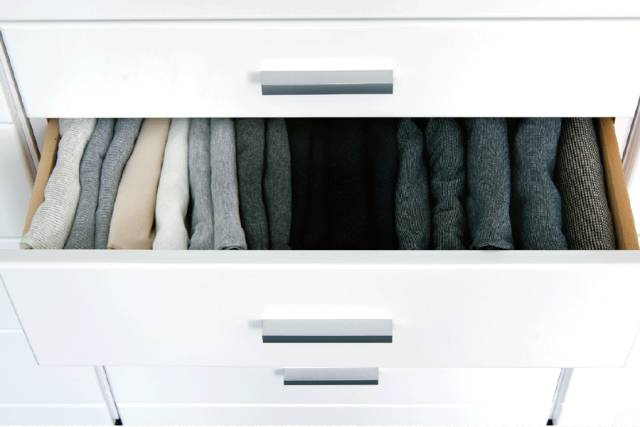 将衣服折好收在抽屉里,可将反折处朝上直立收纳,整齐美观,而且方便取用。看,上面刚刚介绍的小空间折法用到了吧!