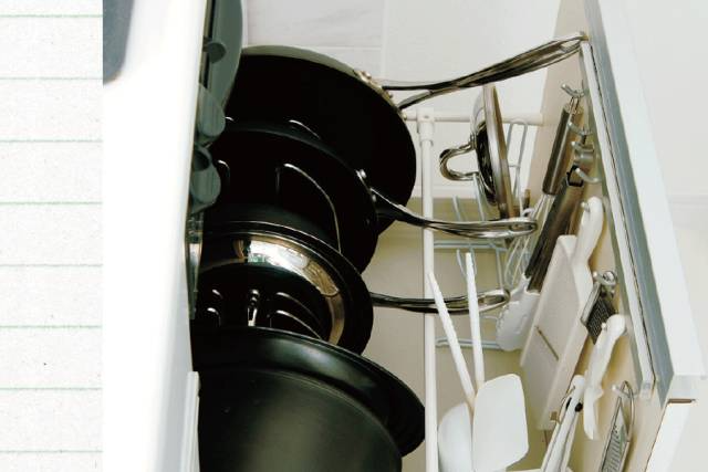 橱柜打造成抽屉的形式,然后放置一个锅具、锅盖专用的收纳架,直立收纳,方便取用。门板后方粘上挂钩,还可以收纳一些料理工具。