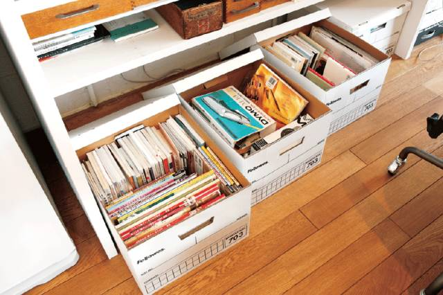 不断增加的书籍、资料、CD、DVD都可以放在纸箱里,因为比较重,可以直接放在地上,桌子下面、床底的空间也可以利用起来。