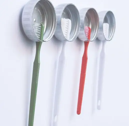平时可以将饮料盖子之类留下来,然后可以将瓶盖边缘打一个洞。将它们再贴在墙上,可以很好的收纳牙刷,但是要注意使用的瓶盖尽量保持一致,不然花花绿绿可能影响美观。