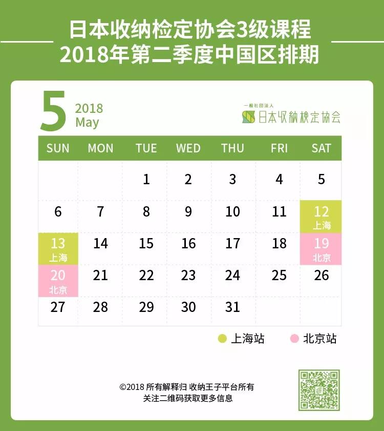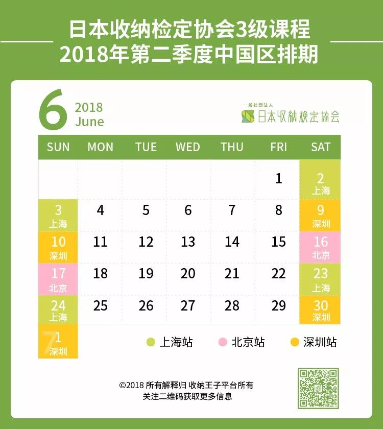 日本收纳检定协会三级课程2018年第二季度中国区的课程排期如下,想要参加课程的学员们可以提前规划自己的日程表啦~