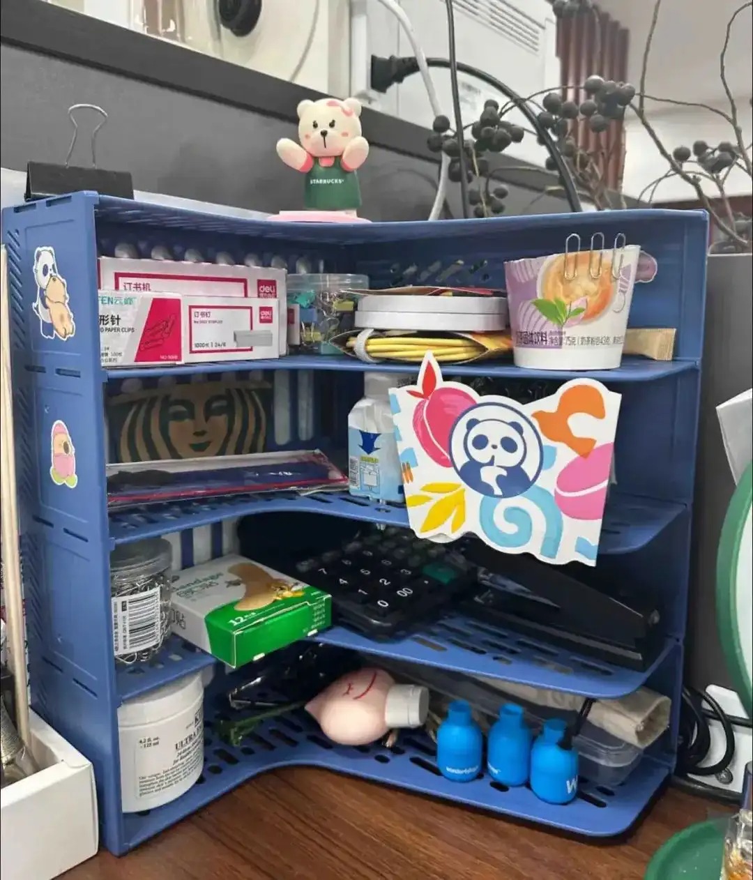 只需要找行政要一个文件夹,然后给它横着一放,就是一个非常适合桌面的收纳架,L型的,还能充分桌面空间,更能装。