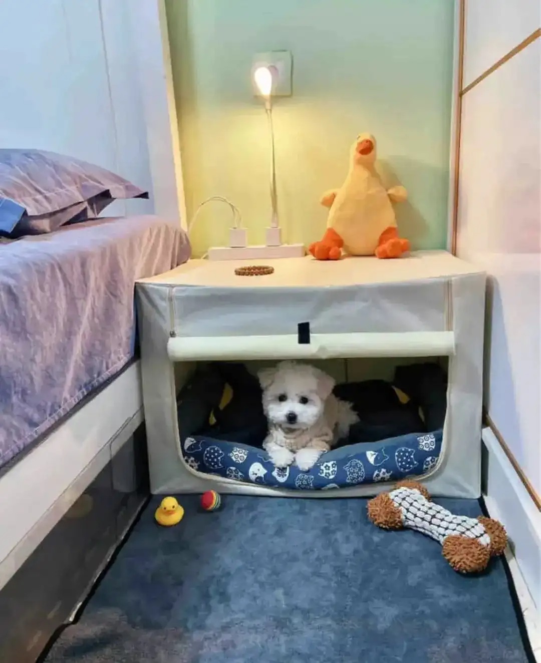 直接把棉被收纳袋,拿下来给它当窝即可,侧面可以开合,也就是狗窝的门了。