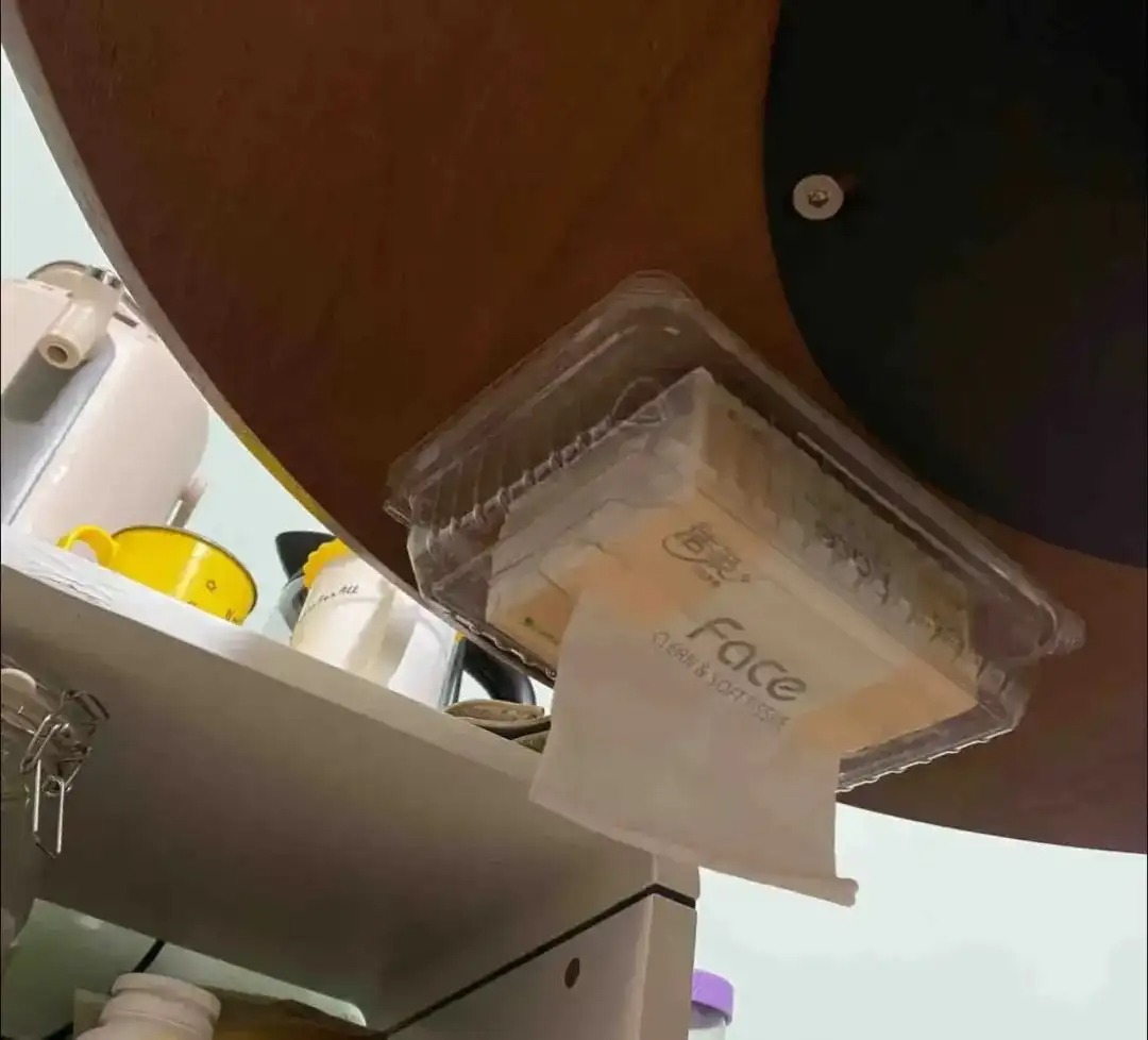 然后再盒子上方开一个孔,再把盒子粘在餐桌背面,如此取纸巾又方便,又不至于占桌面空间。