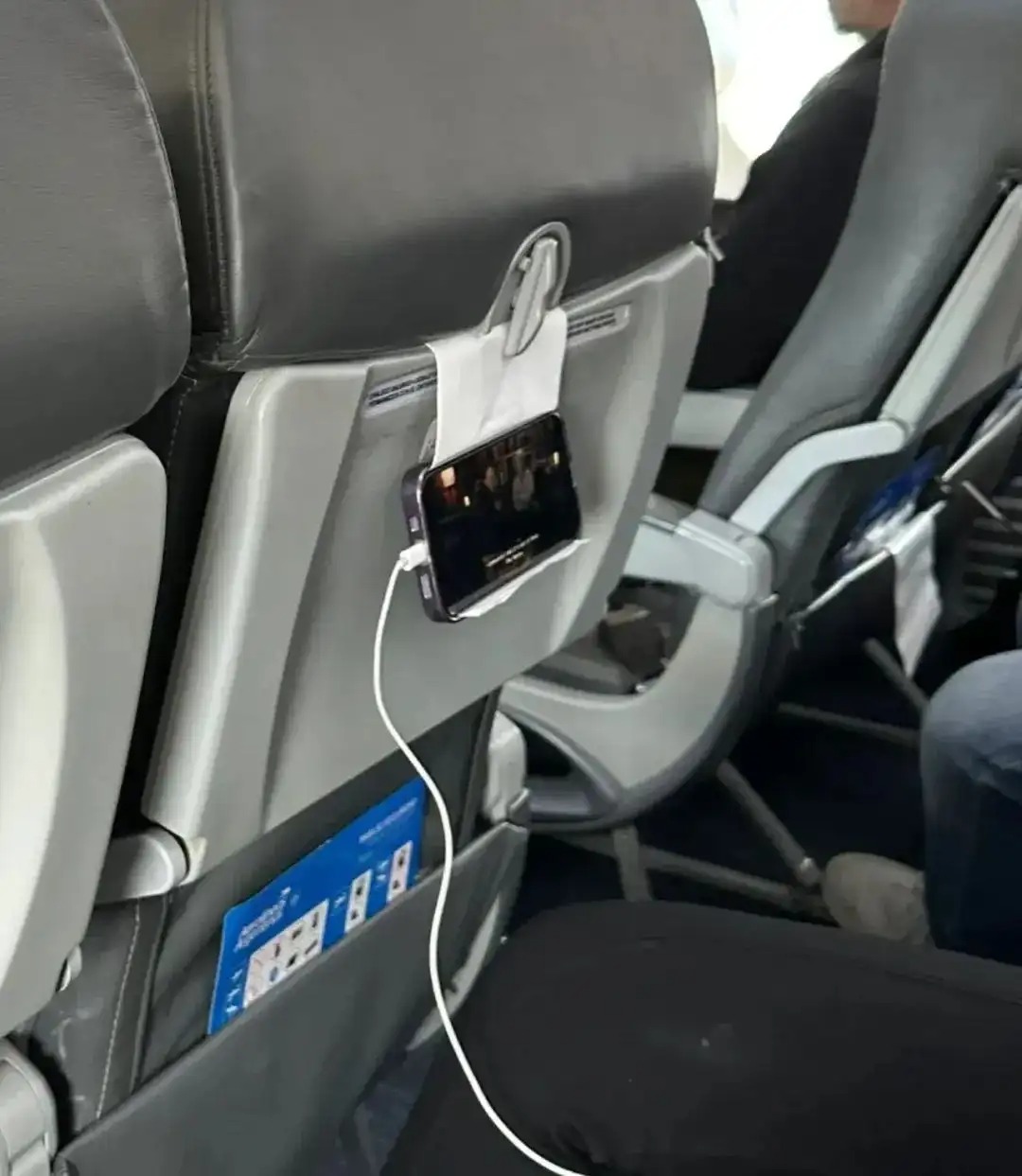拿一张纸巾,夹在手机壳里,然后另外一头再用桌板夹给它一夹,一个后排娱乐影音系统就做好了。