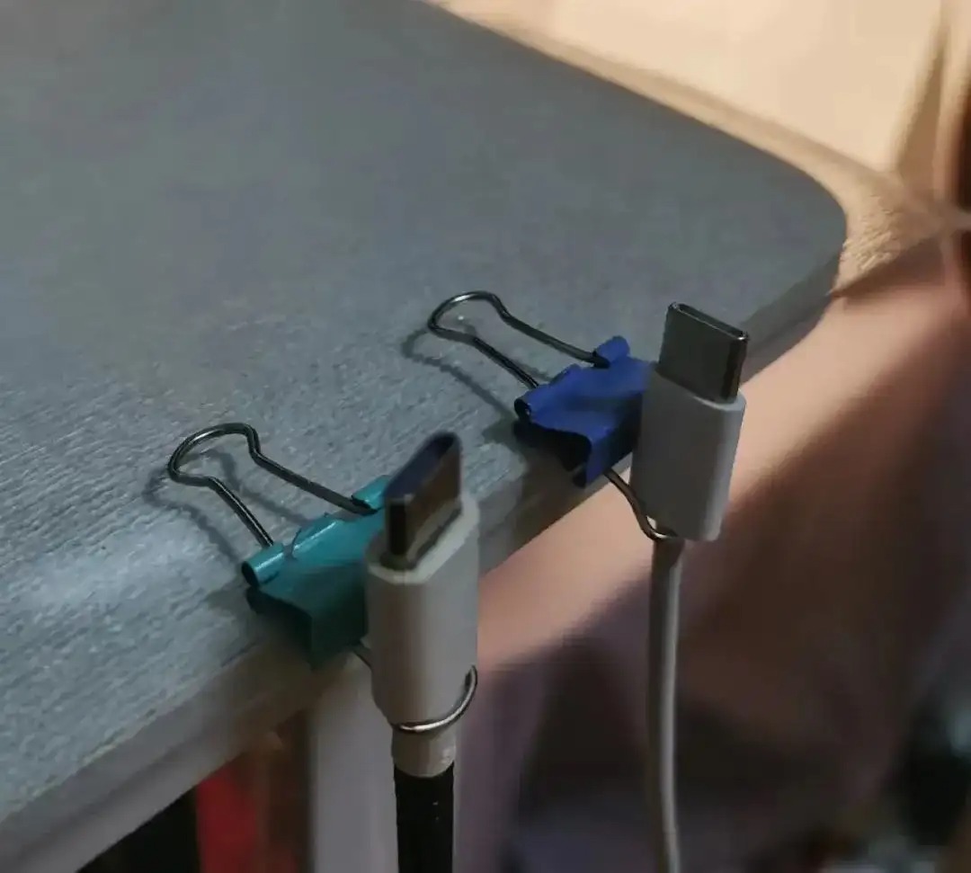 你可以花钱买固线器,也可以不花钱,如果家里有这种长尾夹,拿出来。