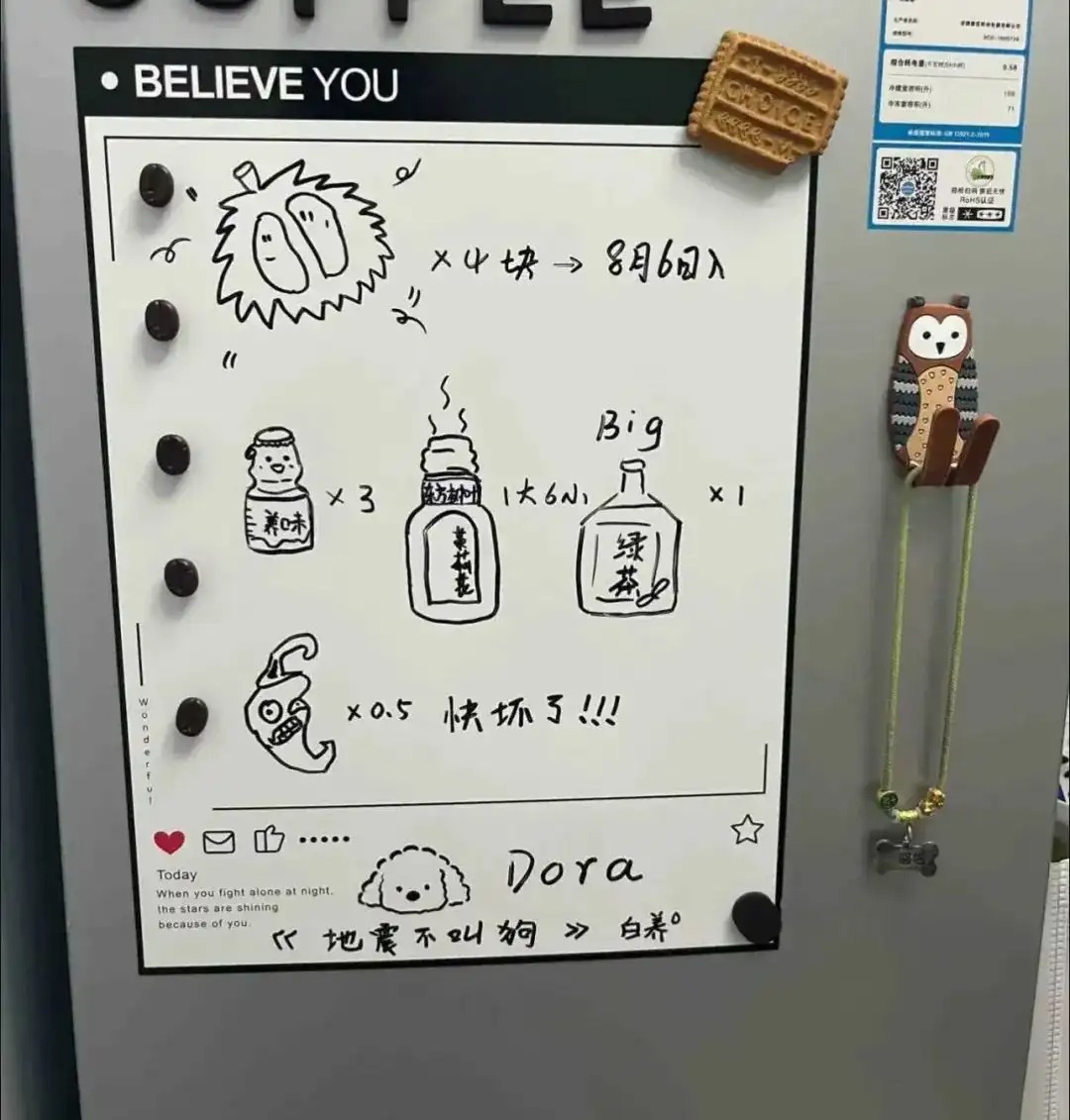 现在不是有人,给冰箱上弄这种写字板,目的是为了记住记录食材的放入时间,以防过期。
