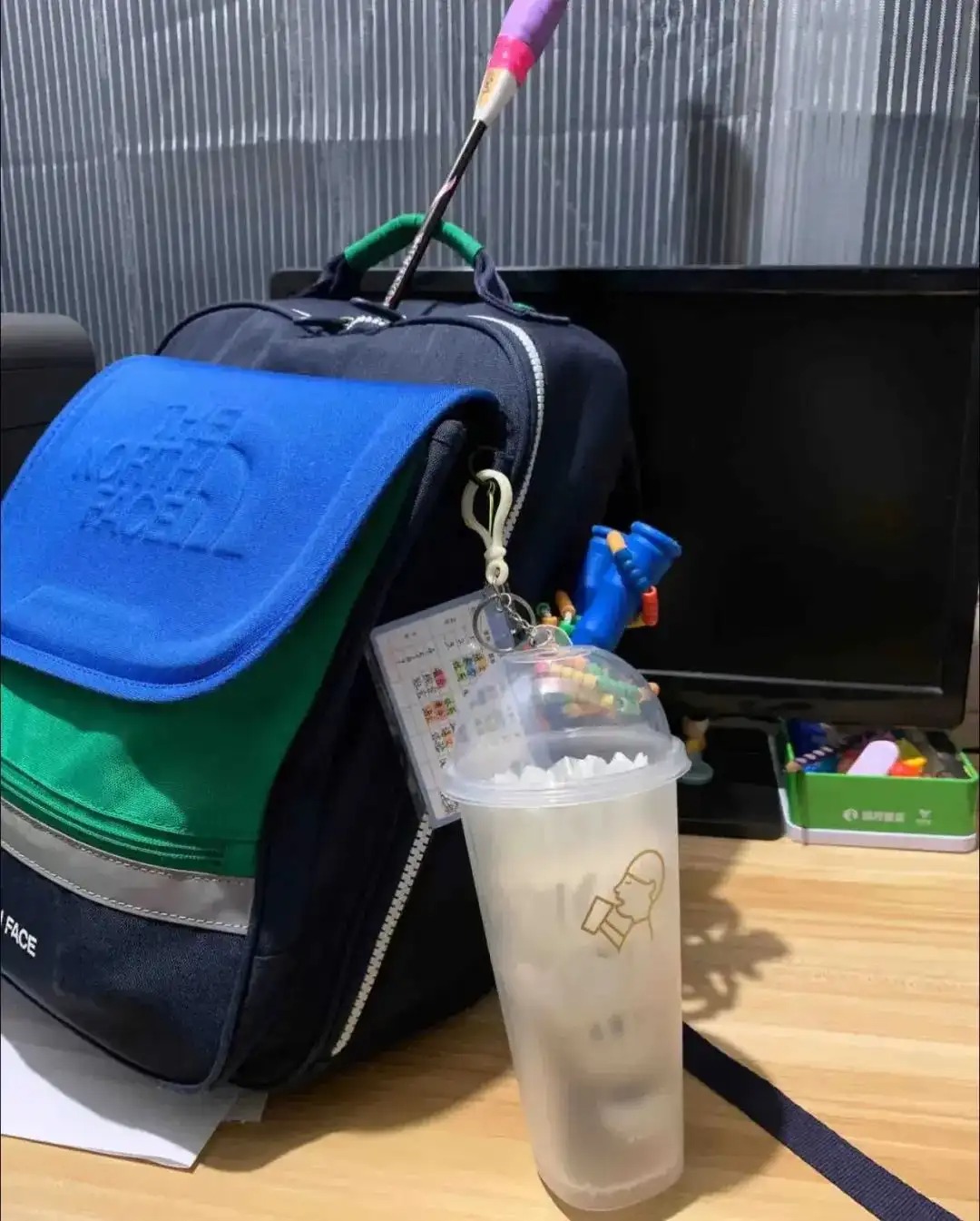 为了解放双手,你可以拿一个奶茶杯子,然后给它打上孔,再搭配上钥匙链,就可以解放双手了,也不怕羽毛球被压坏。