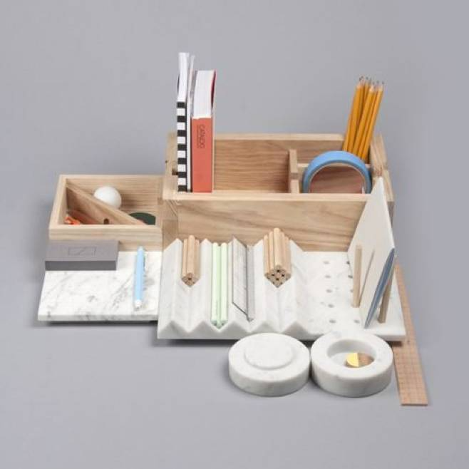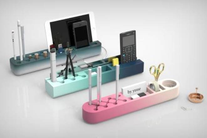 利用带圆孔的收纳盒、收纳筒和不同层次的收纳格,轻松收纳桌面小物、文具和化妆品。