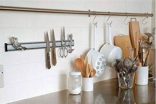 除了利用S型挂钩,墙面挂杆等常规工具以外,还可以使用磁铁进行悬挂收纳。