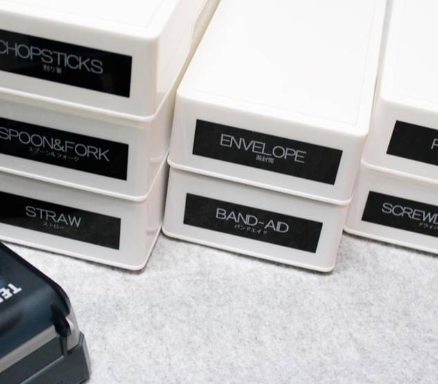 只要贴对标签,快速把需要整理的物品置入收纳容器中。之后找东西的时候,就算盒子里面再乱,也能迅速找到。