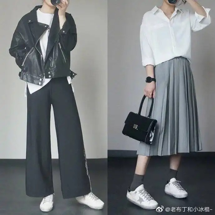 白色T恤搭配一条黑色运动裤,外穿一件机车服,超级帅气的打扮,尤其是今年非常流行运动裤,潮流指数很高的哦。白色衬衣搭配一条灰色百褶裙,一深一浅非常文艺的打扮哦,休闲又大方,像职场小姐姐也可以这样搭配哦。