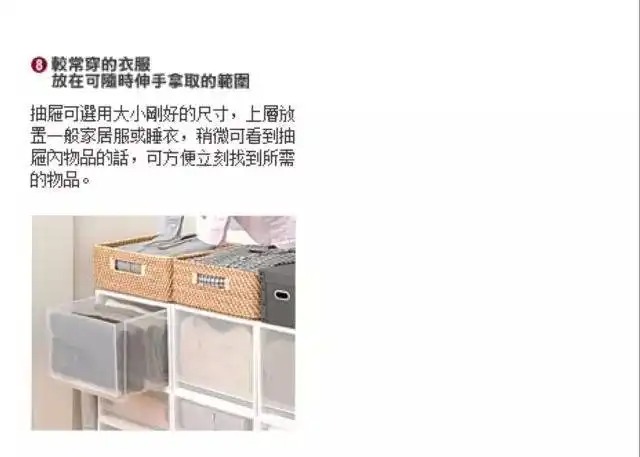 数字4:内衣物和各种T恤裤子分类,放置在可抽拉的收纳箱中