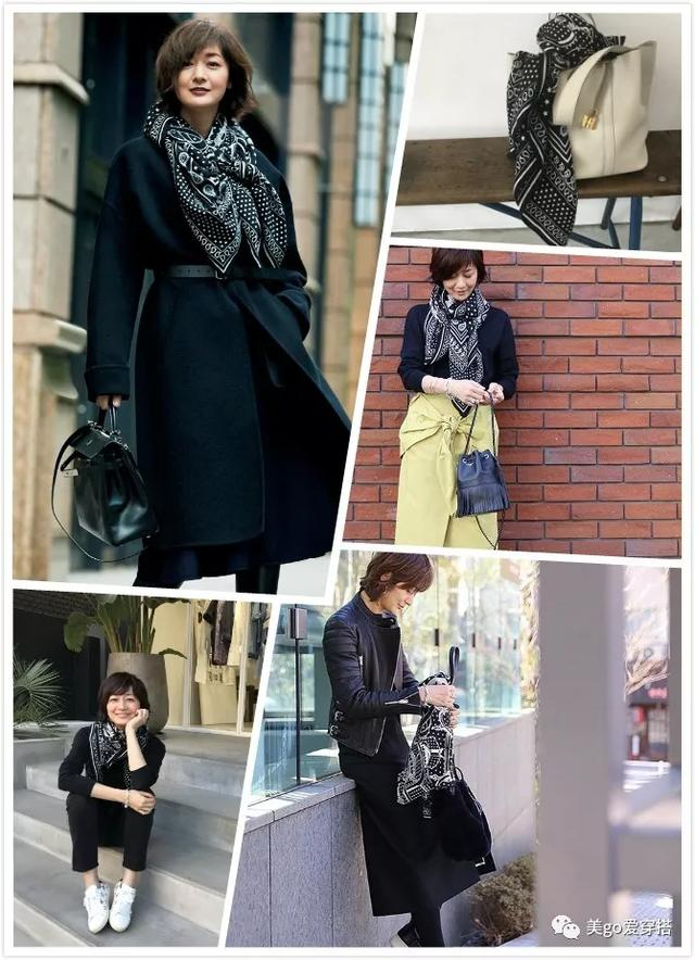 经典百搭的黑底白花围巾不分年龄和场合,用它搭配黑色上衣,增添丰富感和雅致。▼