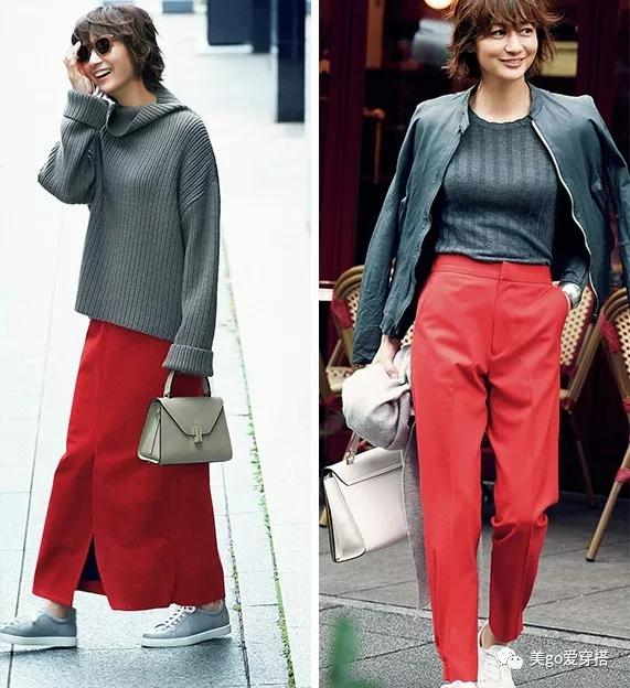 红色与灰色是一对完美搭档,一个热烈张扬、一个低调内敛,红色的裤装或裙装搭配灰色的外套或上衣,包围巾等都用中性色,整体色彩丰富而和谐。▼