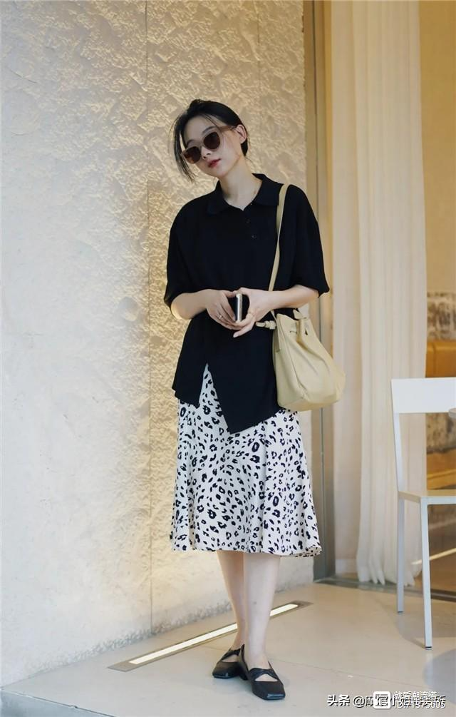 下半身搭黑白豹纹图案半裙,呼应黑白色系的同时,黑白豹纹也成为这套的亮点,却不会太突兀,自腰线呈现出A字版型,在视觉上起到收腰遮跨的作用。