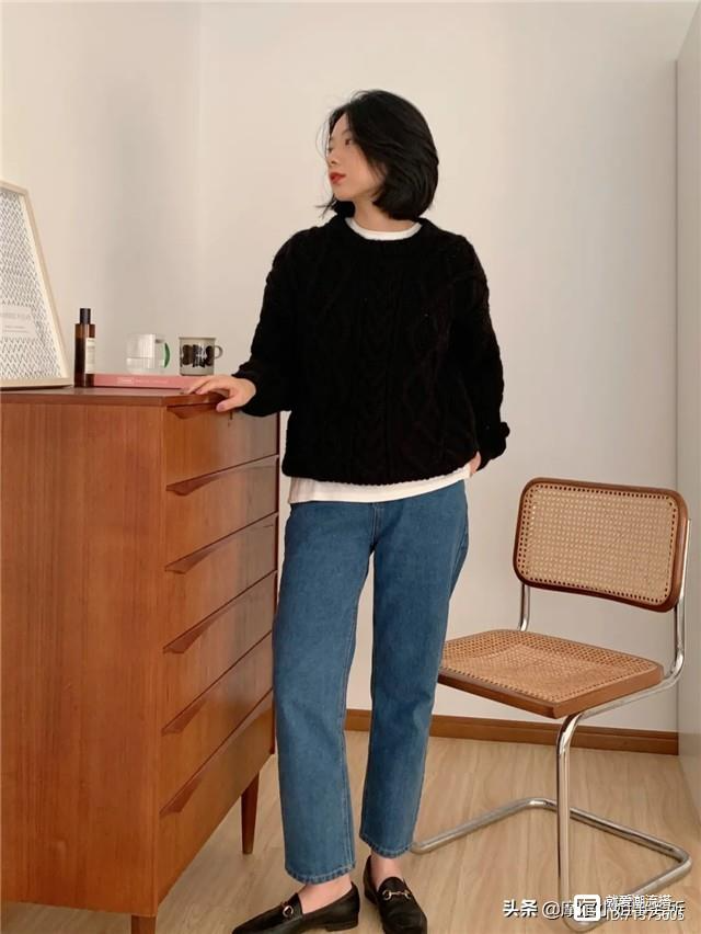 黑色毛衣百搭,基本每个秋天都会备着一件,市面上常见款式,长度都只是刚刚到胯最宽的位置,这并不适合下半身偏胖的女性,里面可以试着搭配些T恤或者衬衫,露出有颜色的领子和衣摆,颜色和材质上做出叠穿的效果,能提升整体的层次感,内搭的服饰单品衣长可以稍微长一些,时尚感满满。
