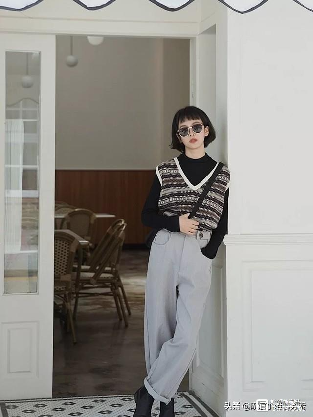 上半身是黑色内搭+花色马甲的搭配,是学院风的搭配公式,为了避免过于花哨,用了同色系做搭配,整体更偏风格感。下半身搭配了浅色牛仔裤,休闲也配合复古风,高腰直筒阔腿裤型和牛仔面料相遇,带着校园的轻松feel。