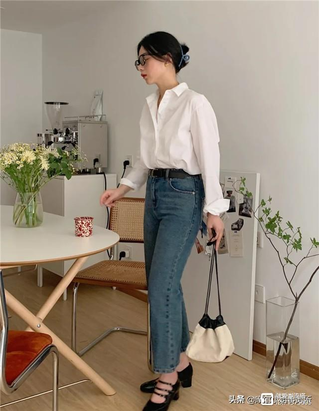 除了选择肥大的阔腿裤,还可以选择略微修身的直筒牛仔裤,推荐选择材质版型偏硬的牛仔裤,这样就不会完全暴露不好看的腿型线条了,同时还能够优化胯宽屁股大的小问题。