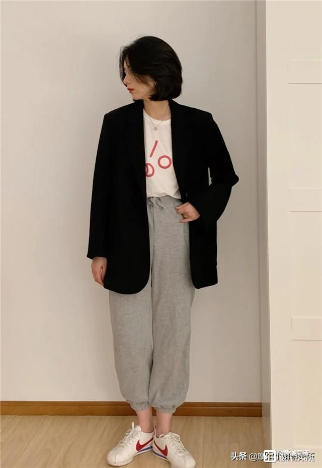 白T恤和运动裤的搭配太简单太普通,不仅如此,灰色运动裤对下半身偏胖的女孩太不友好了,浅灰色容易显腿粗。