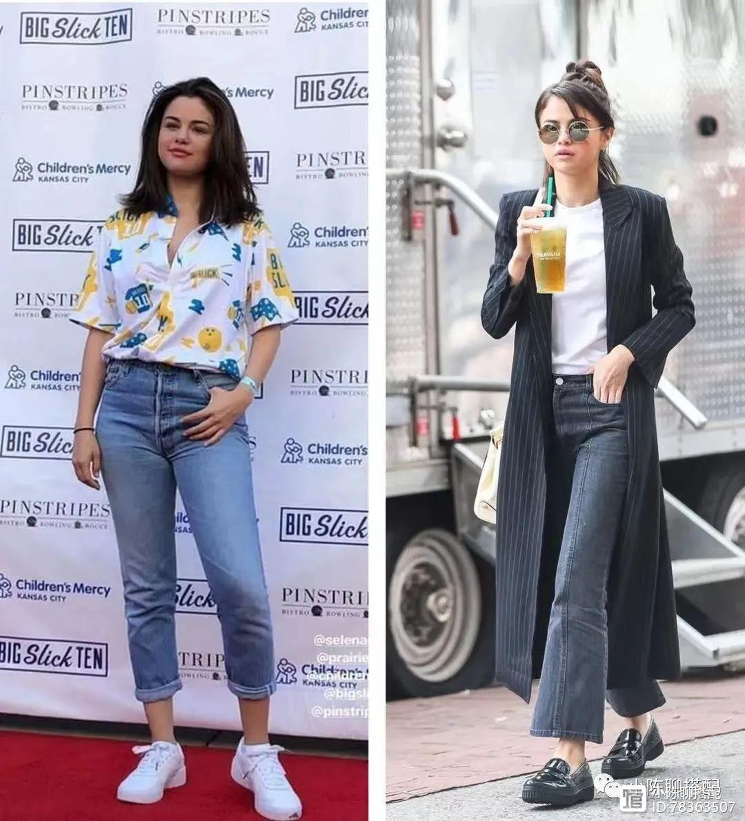 左边的穿搭是错误的穿搭,梨形身材的穿这种短款的外套和紧身牛仔裤会显得上身和腿不成比例,造成视觉上腿部短小,而且这种装扮会让我们将视线注意到突出的胯部,将胯部的缺陷展示的很明显。