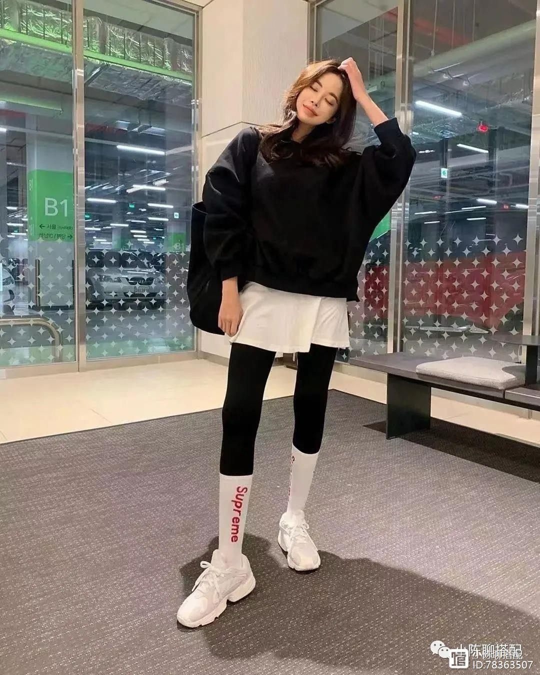 这样的穿法使得自己的上半身的肥胖被遮挡,而露出的地方又是非常纤细的双腿,真的是即遮肉又显高,将自己的优点全都展现了出来。