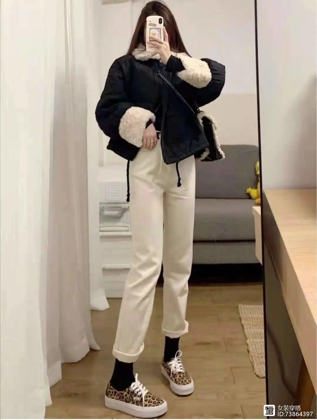 上衣是短款黑色菱格棉衣,这件外套看起来太乖了,保暖又藏肉,下装穿的是米白色牛仔裤,直筒的版型上身没有束缚感,高腰的设计特别显腿长腿直,鞋子是豹纹帆布鞋。