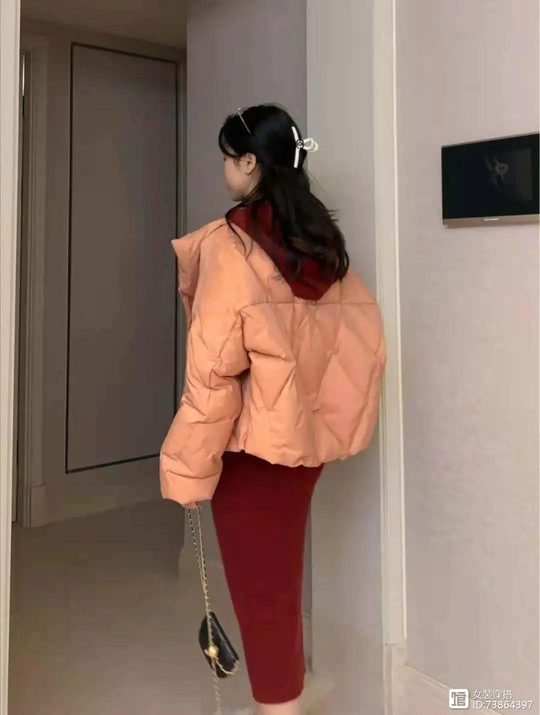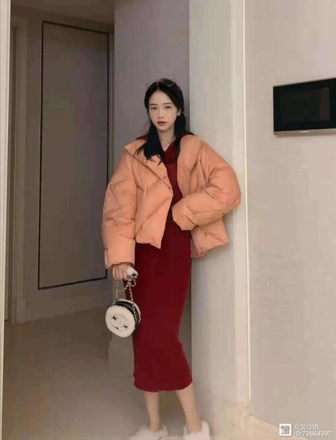 羽绒服是烤奶色上身超嫩,感觉能掐出水,hen特别的颜色,短款设计,上身显高显瘦,重点是还有少女背。内搭是一件车厘子红的针织连衣裙,这个红色很显白,连衣裙的后面还带了帽子,又十分的减龄,包臀设计还有点点女人味。