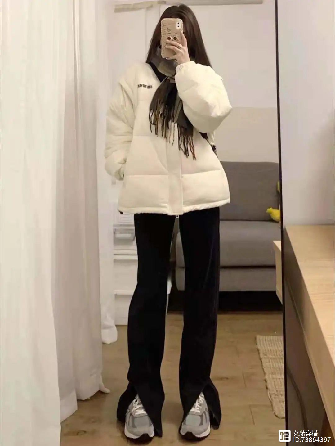 look6 白色羽绒服+黑色加绒打底裤+休闲鞋大白袜