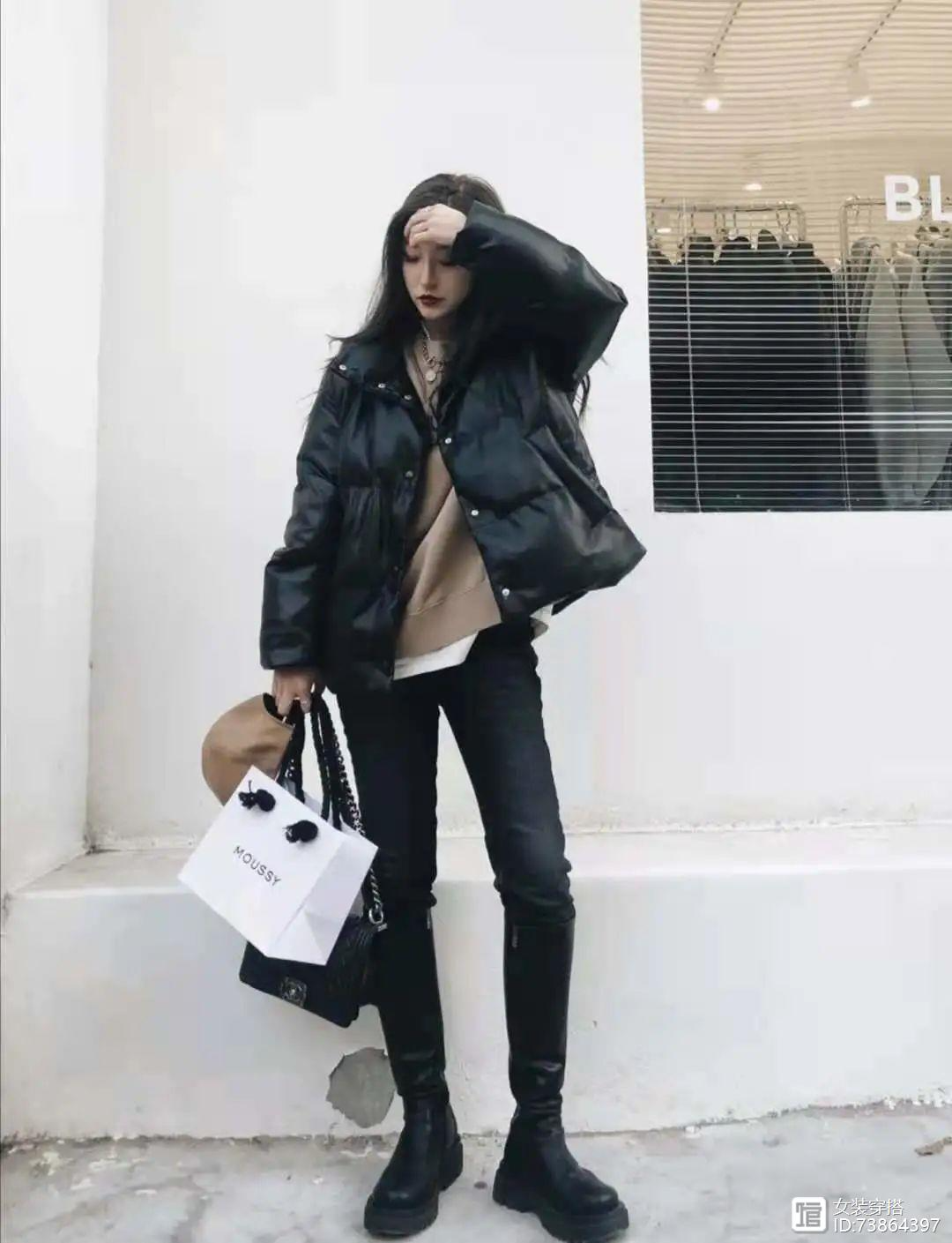 错过了皮西装皮短裤皮短裙,还有皮棉服可以入,这款棉服超帅气 ,特别适合日常穿搭,保暖又好看,关键还百搭,这身look内搭选择了一件绿色的卫衣叠穿了白色的T恤,下装是一条紧身的直筒炭黑色牛仔裤搭配了黑色的长筒靴。