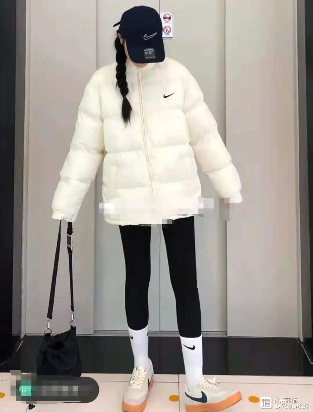 Nike 耐克短款超级适合小个子穿,白色是最干净最百搭也是最好看的,可盐可甜可温柔温暖不挑人,搭配黑色加绒打底裤完美,当然少不了大白袜和休闲鞋了