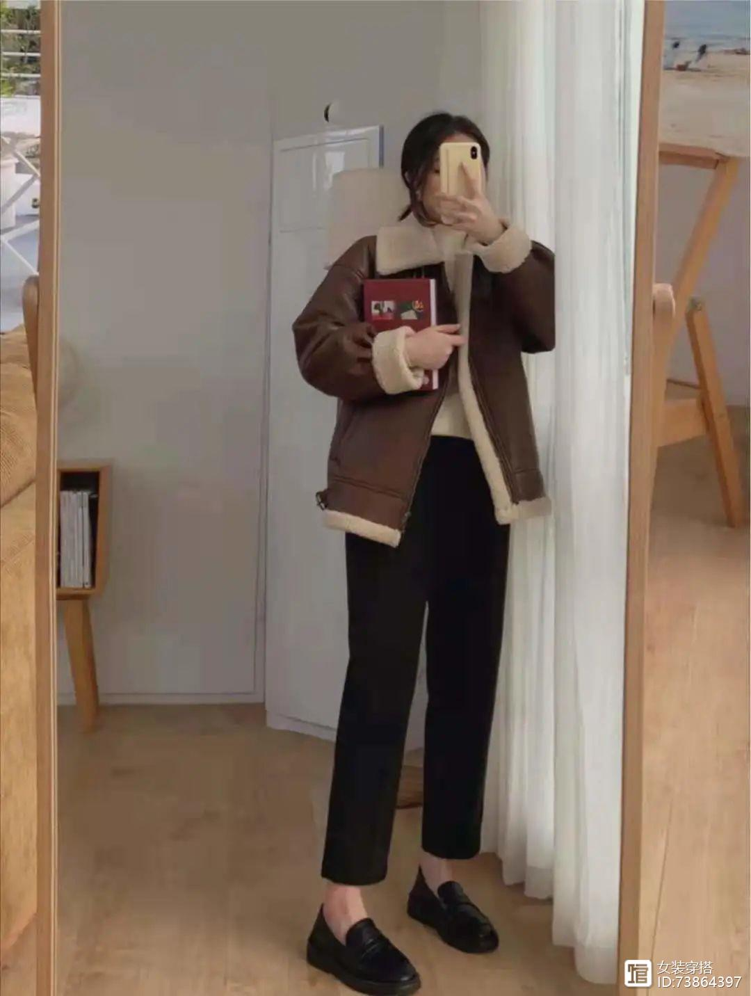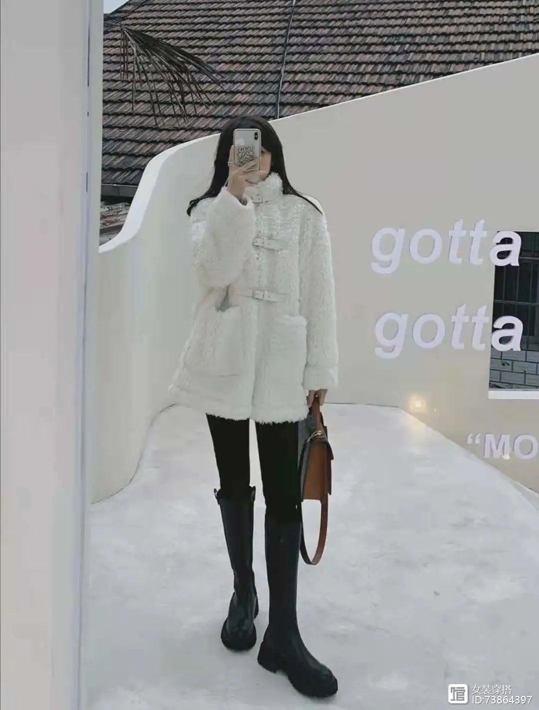 最近都在不露腿穿搭,白色立领羊羔毛毛外套搭配黑色小脚裤+黑色骑士靴,这套属于不挑人的搭配,小个子超级显比例,毛毛外套还很厚实,里面还能加很多内搭,重点这双靴子好显瘦,特别收小腿,而且加绒的也很暖和,后跟是有拉链的,穿脱超方便,圆头显得比较乖巧,但是同时这个版型又比较大气,搭配短外套一绝。
