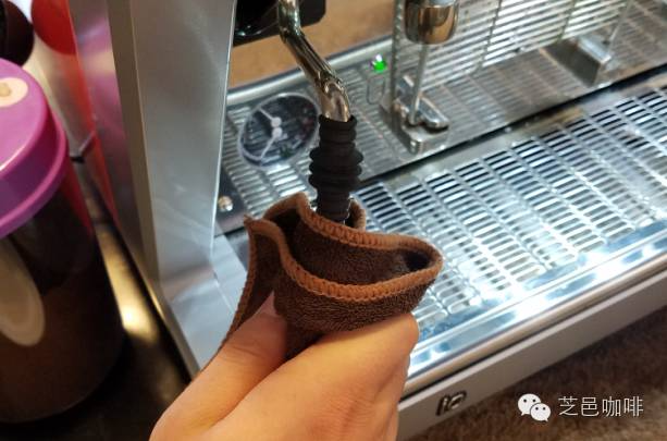 使用蒸汽棒制作奶泡后,需将蒸汽棒用干净的湿抹布擦拭并再开一次蒸汽开关,用蒸汽喷出的冲力清洁蒸气孔内残留的牛奶污垢,以维持蒸气孔的干净与畅通。