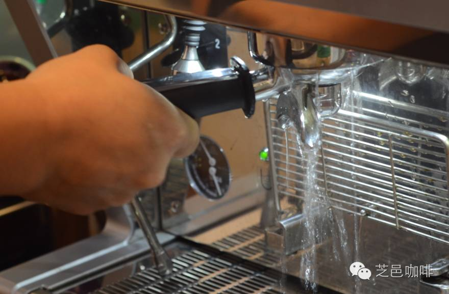 每次制作完成后将手柄取下扣掉咖啡渣饼,并按键将残留在冲煮头内及分水网上的咖啡渣冲下,再将手柄嵌入接座内(注意:此时不要将手柄嵌紧),并左右摇晃手柄以冲洗冲煮头垫圏及冲煮头内侧的咖啡渣。