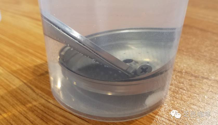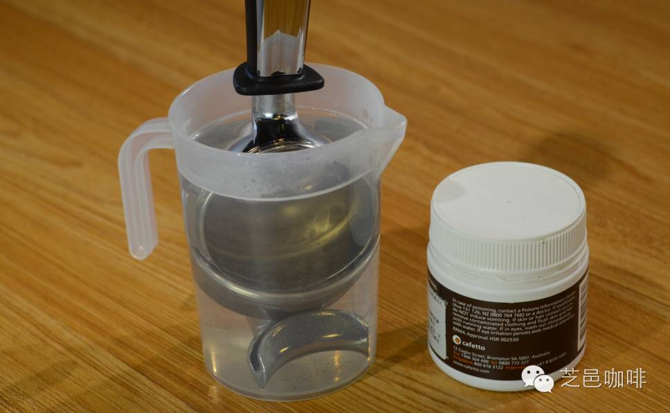 分解手柄并浸泡至清洁液中(500ml热水对三小匙清洁粉混合),将残留的咖啡油渣溶解释出(注意:手柄塑胶部分不可,以免塑胶表面遭清洁液腐蚀),用清水冲所有配件,并用干净柔软的湿抹布擦洗。