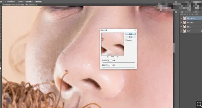 3[复制]图层,使用[污点修复工具]修复皮肤瑕疵细节,[复制]图层,单击[滤镜]-[杂色]-[蒙尘与划痕],具体参数如图示。具体效果如图示。