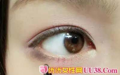 步骤五:选择棕色的眼线膏,因为棕色比黑色更柔和,适合亚洲人的肌肤,不会显得很突兀。然后沿着睫毛根部轻轻将睫毛之间的空隙填满,内眼线就完成了。