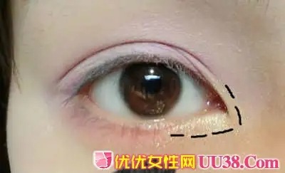 步骤三:在眼睛前方的三角区域轻轻扫上香槟色眼影,一点点就能让眼睛变得尤为明亮。