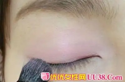 步骤一:首先用大号眼影刷蘸取淡粉色眼影,在眼窝处轻轻晕染开做个基础打底。