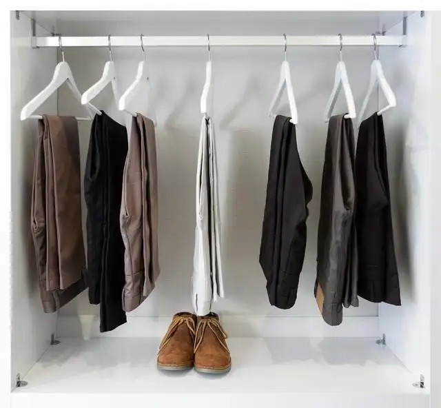 15.裤子不要叠放,将裤子对折放在裤架上,需要用时拿出裤架直接选,挂的时候也很方便。对折悬挂,拿取时一目了然,这样收纳的裤子没有褶皱。