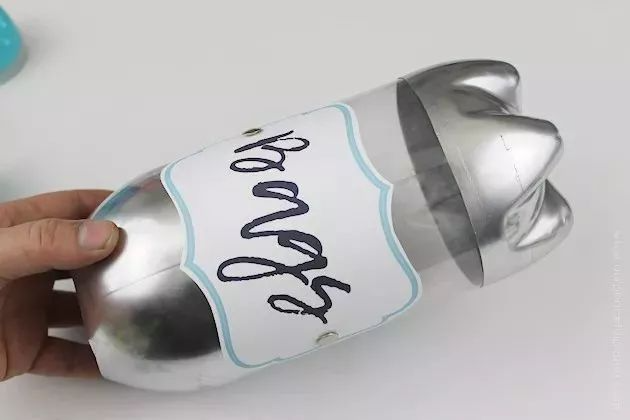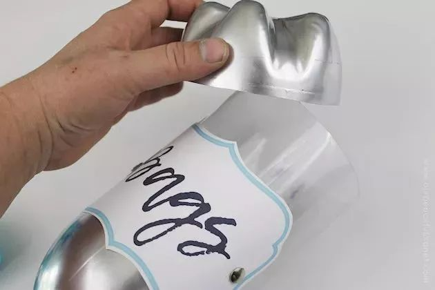 可以用装饰喷漆,喷在瓶底和瓶口部分,做为装饰。还可以在瓶身上贴上标签,表明各类杂物的用途。