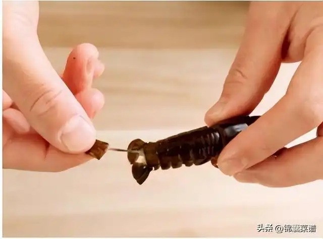 2.抓住小龙虾,捏住虾尾中间的尾部,左右拧松,慢慢拽出虾线,将小龙虾刷洗干净。