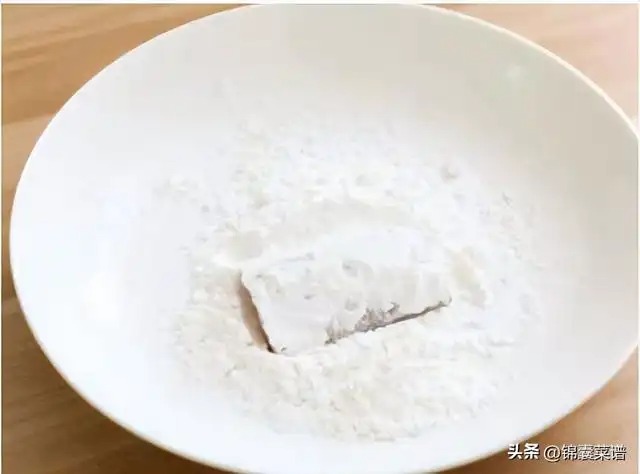 2.腌好的带鱼用厨房纸巾擦干水分,裹上玉米淀粉,把多余的干粉抖去。