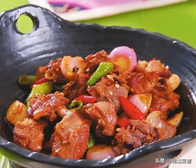 3 锅中加底油烧热,放入姜片、辣椒酱爆香,放鹅肉块、红葱头、小米椒翻炒 10 分钟出香味后,烹入美极鲜酱油上色,加盐、鸡精调味,淋红油,倒入干锅中即可。