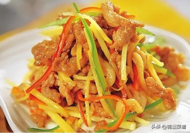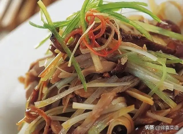 3 油锅烧热,姜丝、辣椒丝下锅煸炒,然后再放入鸭丝,炒出香味后,加调匀的味汁翻炒几下即可。