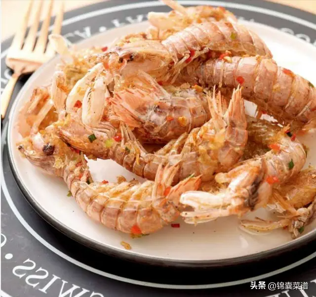 4.锅中倒入适量食用油烧至五成热,下入蒜蓉小火慢煎,10 分钟后出锅,将蒜蓉铺在虾上,淋上调好的酱汁。